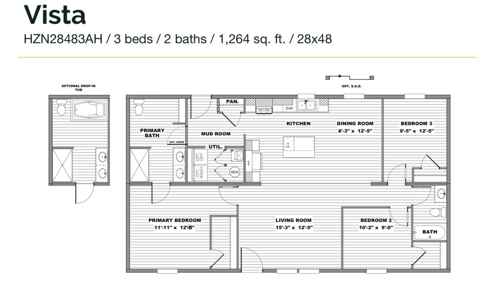 The Clayton Homes Vista is a stylish and modern manufactured home designed for both comfort and functionality. Featuring three spacious bedrooms and two full bathrooms, this open-concept floor plan creates a welcoming flow between the kitchen, dining, and living areas—perfect for entertaining or family gatherings. The split-bedroom layout provides added privacy, with the primary suite separated from the secondary bedrooms. The ensuite bathroom boasts a double-sink vanity, offering both convenience and elegance. Additionally, the home includes a dedicated utility room with washer and dryer hookups, ensuring practicality and efficiency for everyday living.