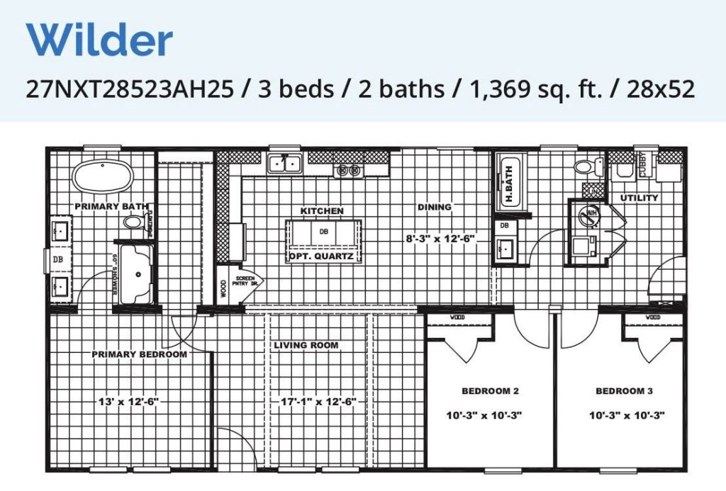 The “Wilder” (52NXT28523AH) is a thoughtfully designed manufactured home that offers 3 bedrooms and 2 bathrooms within about 1,369 sq ft of living space, blending functional layout with modern style for everyday comfort. It features an open common area ideal for family gatherings, a well-appointed kitchen, and private bedroom spaces that balance social and personal living needs.